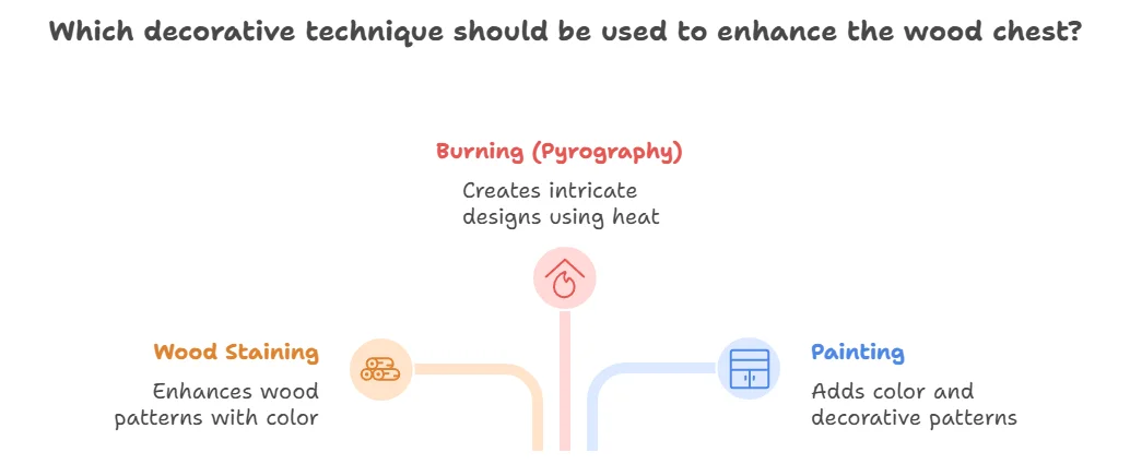 Decorative techniques can elevate your wood chest significantly. Here are some popular methods: