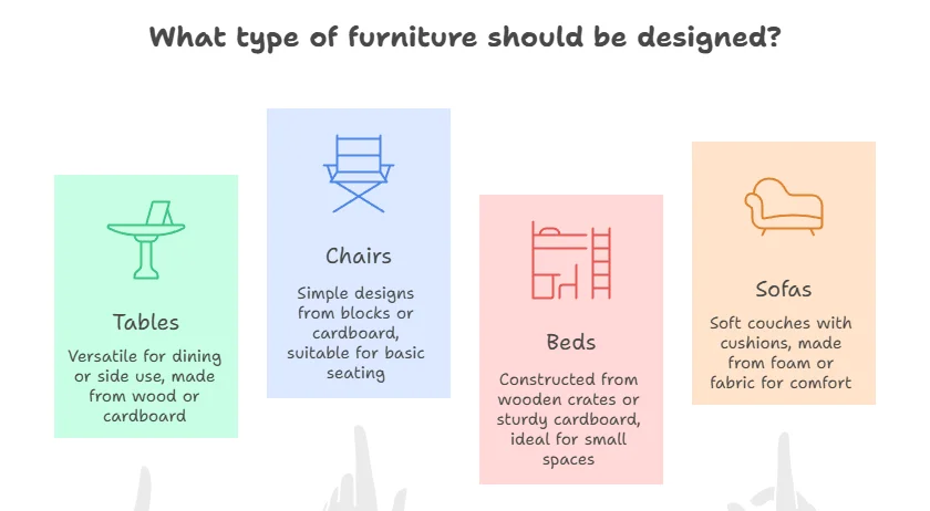 - Tables: Create different styles—like dining tables or side tables using wood or cardboard.
