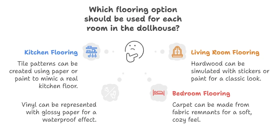Flooring can dramatically change the look of each room in your dollhouse. Here are some flooring ideas: