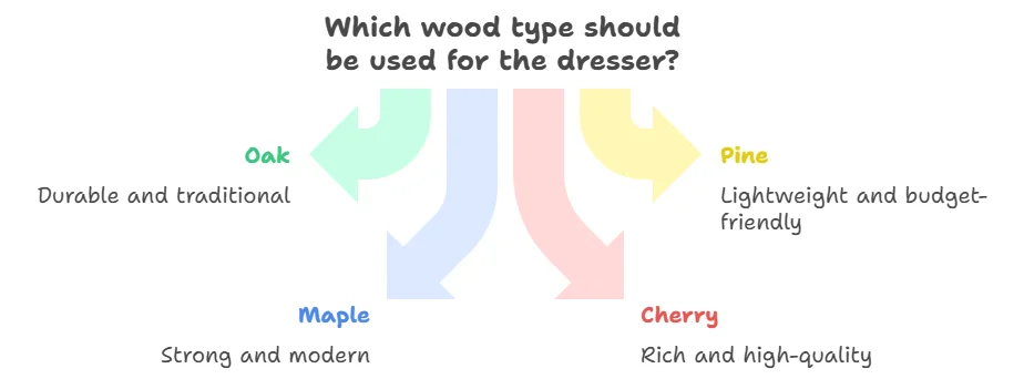 Choosing the right wood is crucial for your dresser’s durability and appearance. Here’s a list of common types of wood you might consider: